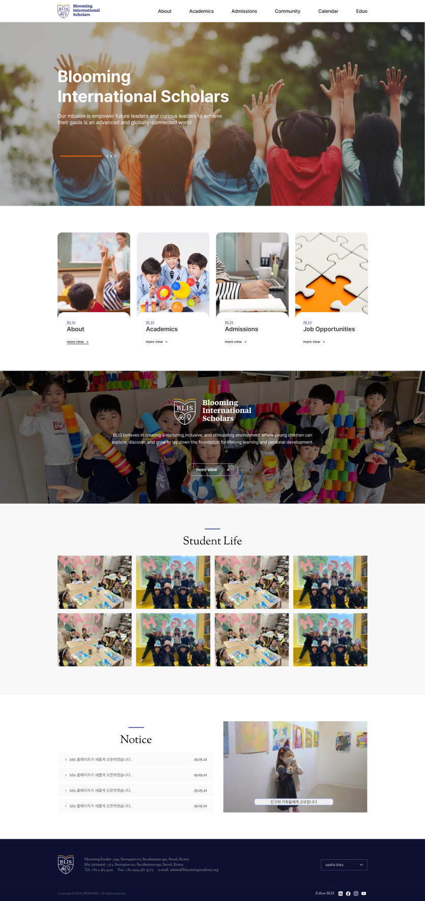 교육 분류 홈페이지 제작 작성자 정보 최고관리자 작성 작성일 2026.01.18 12:56 컨텐츠 정보 4 조회 목록 본문 태그 #기업형, #교육, #어린이, #학교, #학원 관련자료 링크 https://www.bloomingacademy.org/sub/main.php 2 회 연결 이전 홈페이지 제작 작성일 2026.01.20 10:11 다음 홈페이지 제작 작성일 2026.01.15 13:59 댓글 0 등록된 댓글이 없습니다. 로그인한 회원만 댓글 등록이 가능합니다. 목록